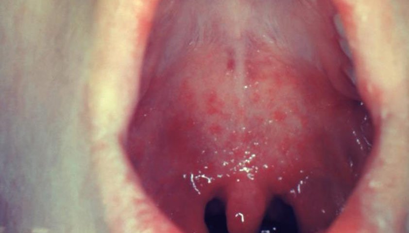 коревая энантема – крупные красные пятна на мягком и твердом небе;